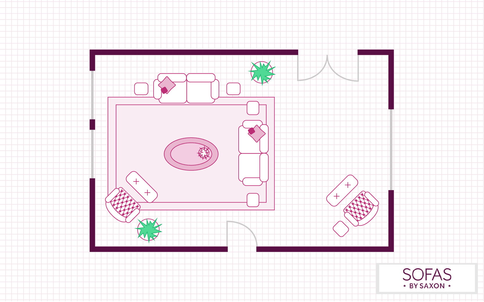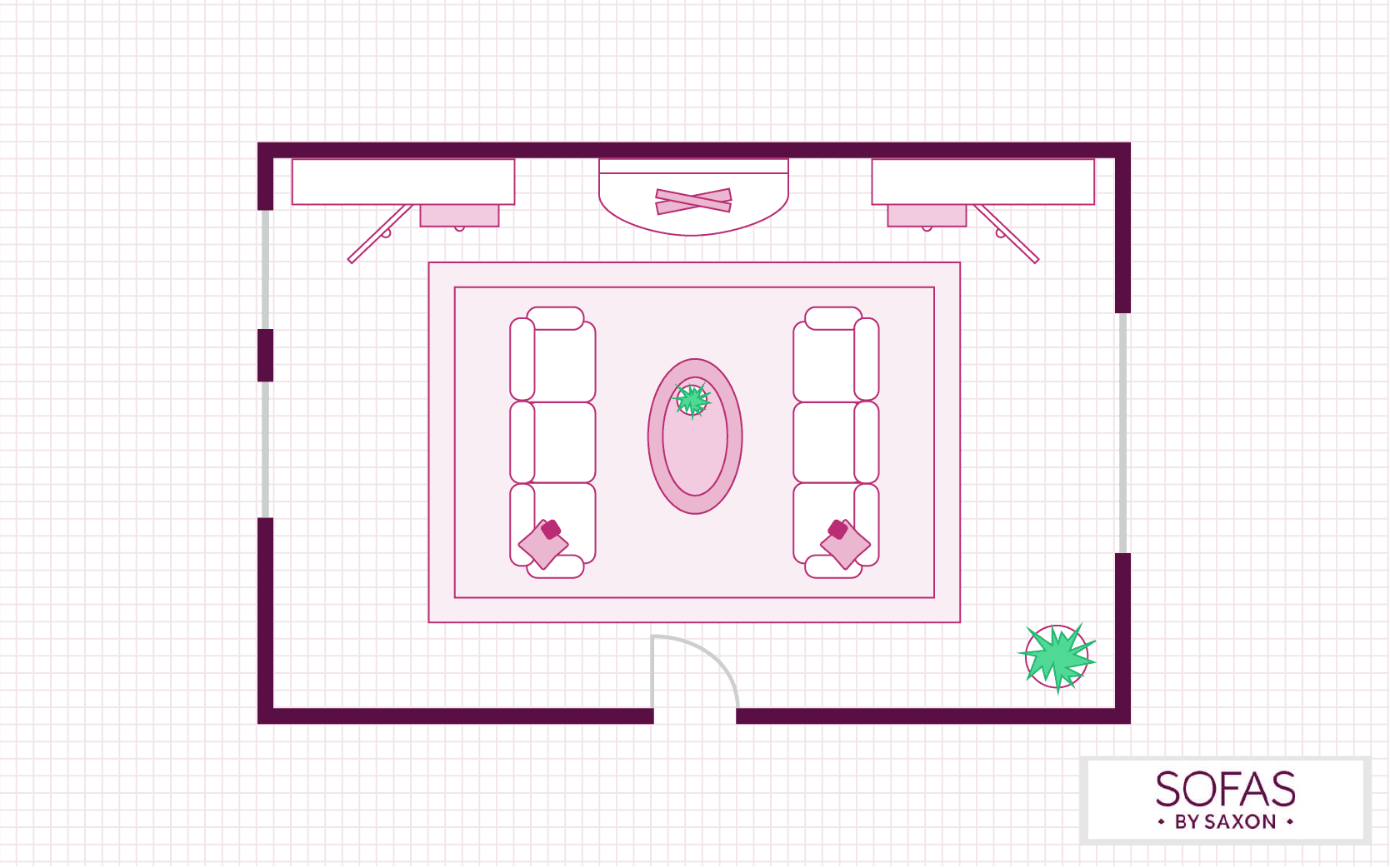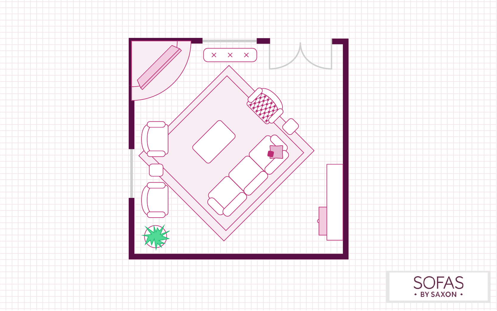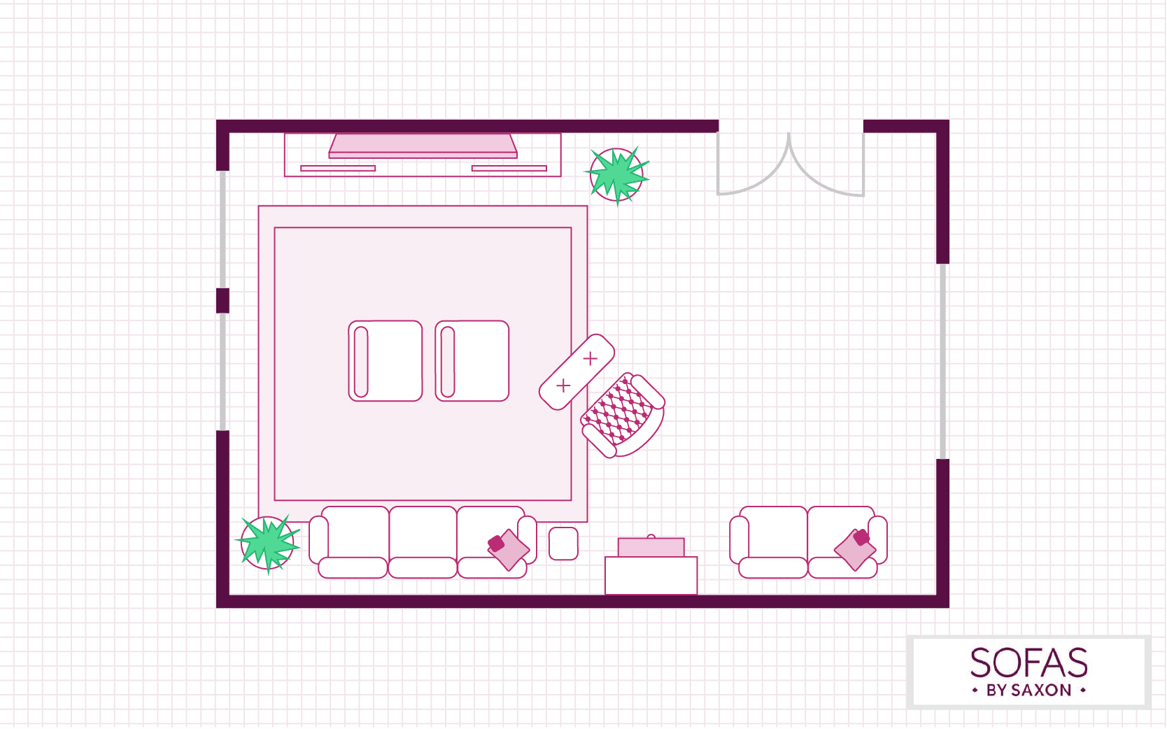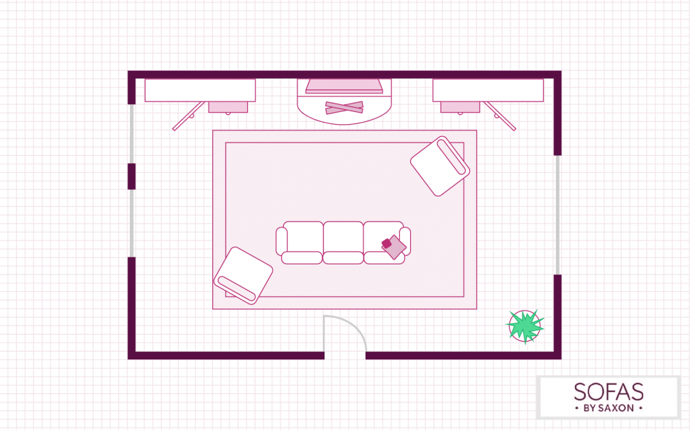 Similar to the above layout, this floorplan focuses on turning the living room into a social hub. Two sofas placed adjacent to each other will encourage conversation, while the addition of an extra armchair and footstool can ensure there are plenty of seating options for any occasion.