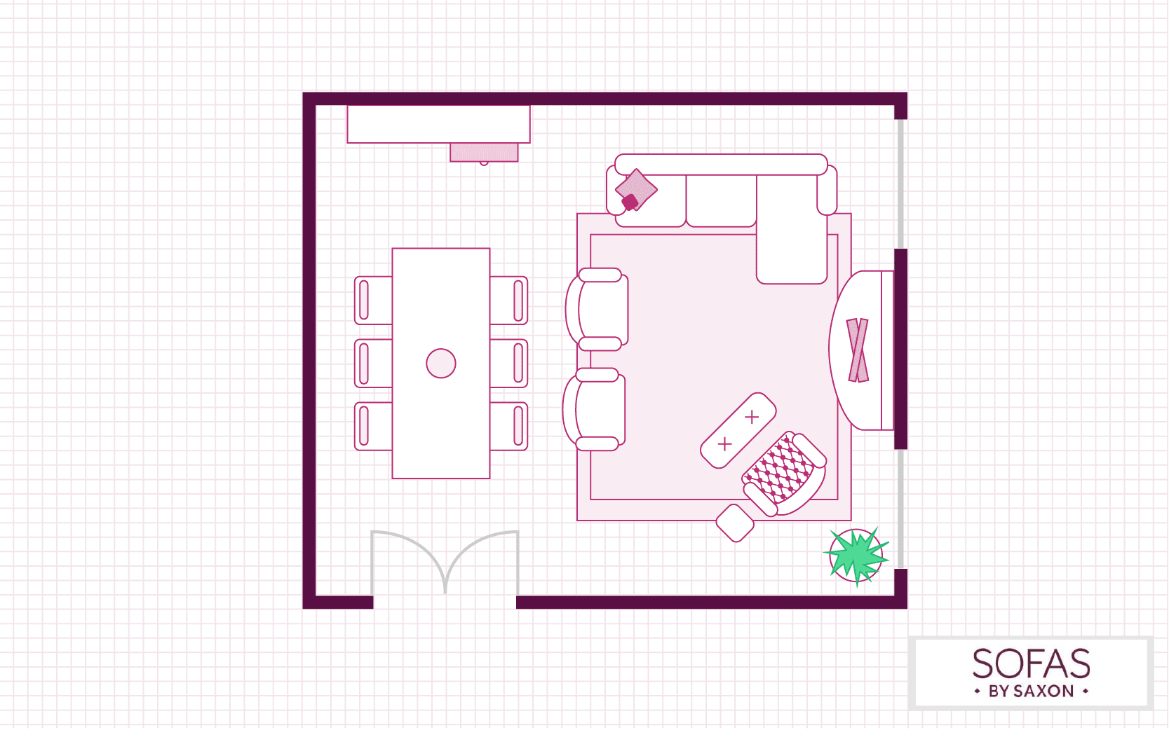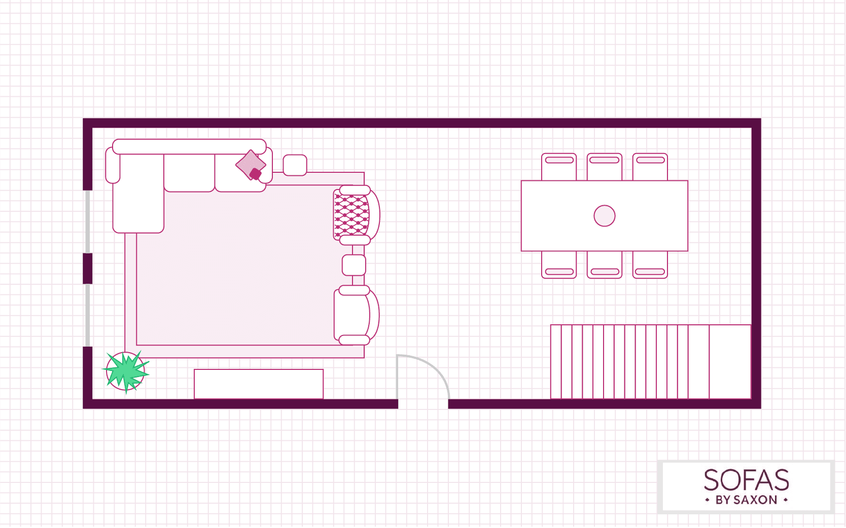 The layout of your living room doesn’t need to be bound to any restrictions, and this living room plan is testament to that. If you have a larger lounge with a lot of space, why not look at adding a dining area? You can use your furniture and rugs to define the different zones.